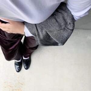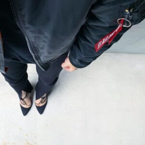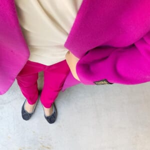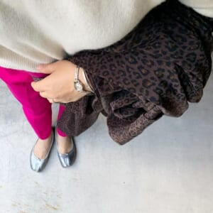 シルバーのマルジェラ足袋シューズとビビッドなピンクのパンツコーデ