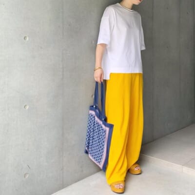 Yellow pants and yellow sandals. The accent scarf eco-bag is too easy to use.