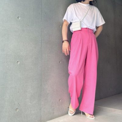 ユニクロ セオリーコラボ モックネックTとGU ピンクパンツコーデ