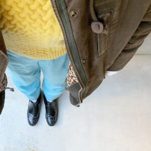 チャーチ ケツビーとモッズコート、黄色のセーター、ライトブルーのパンツのコーデ
