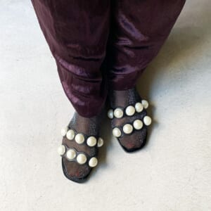 アローズのブラウス、 ザラのハイウエストパンツ、 マノロのパンプスの入園式ママコーデ